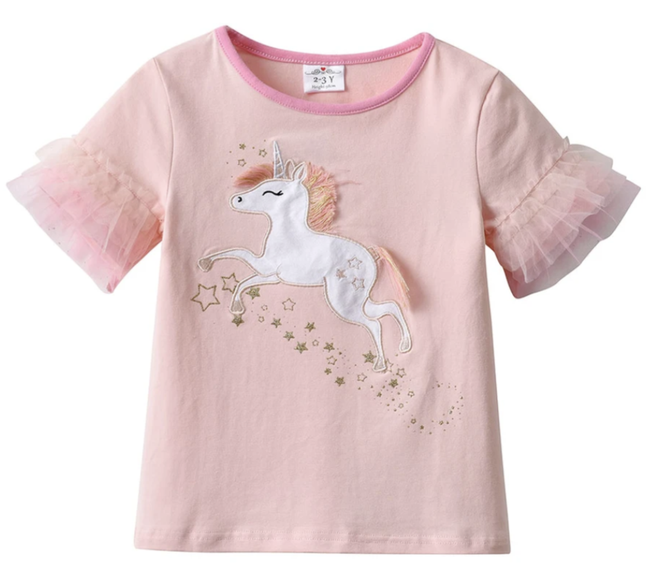 This adorable top is so unique. The unicorn's hair is 3D and the sleeves have tulle ruffles! It's very "boutique" looking. 😉